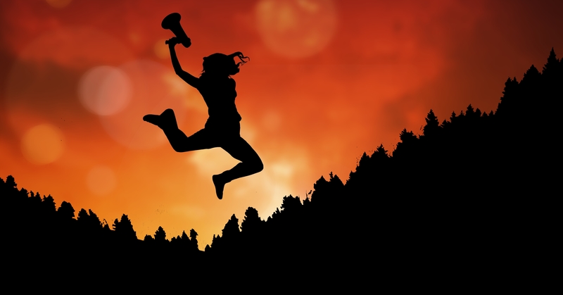 Businesswoman holding megaphone while jumping on mountain during sunset